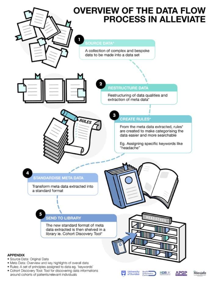 The Alleviate project combines expertise from leaders in pain research, people living with pain and the Health Informatics Centre (HIC) team. HIC is based at the University of Dundee and the team have over 20 years’ experience working with large complex data sets made up of different types of data. We also work with members of the Digital Research Service (DRS) and use the Five Safes Framework to ensure a secure approach to the use of that data. The Alleviate pain datasets can be found at the Health Data Gateway.
